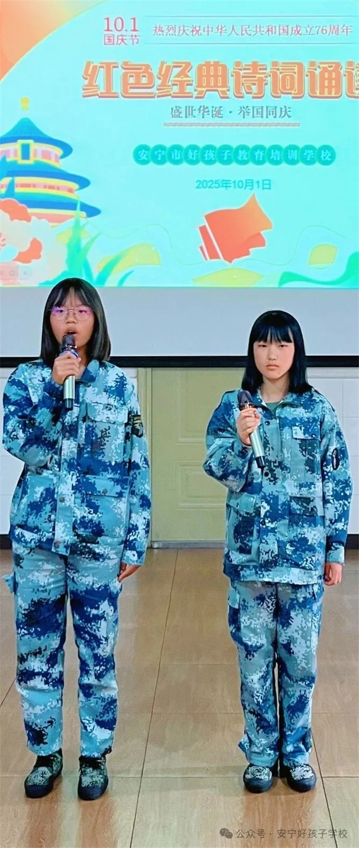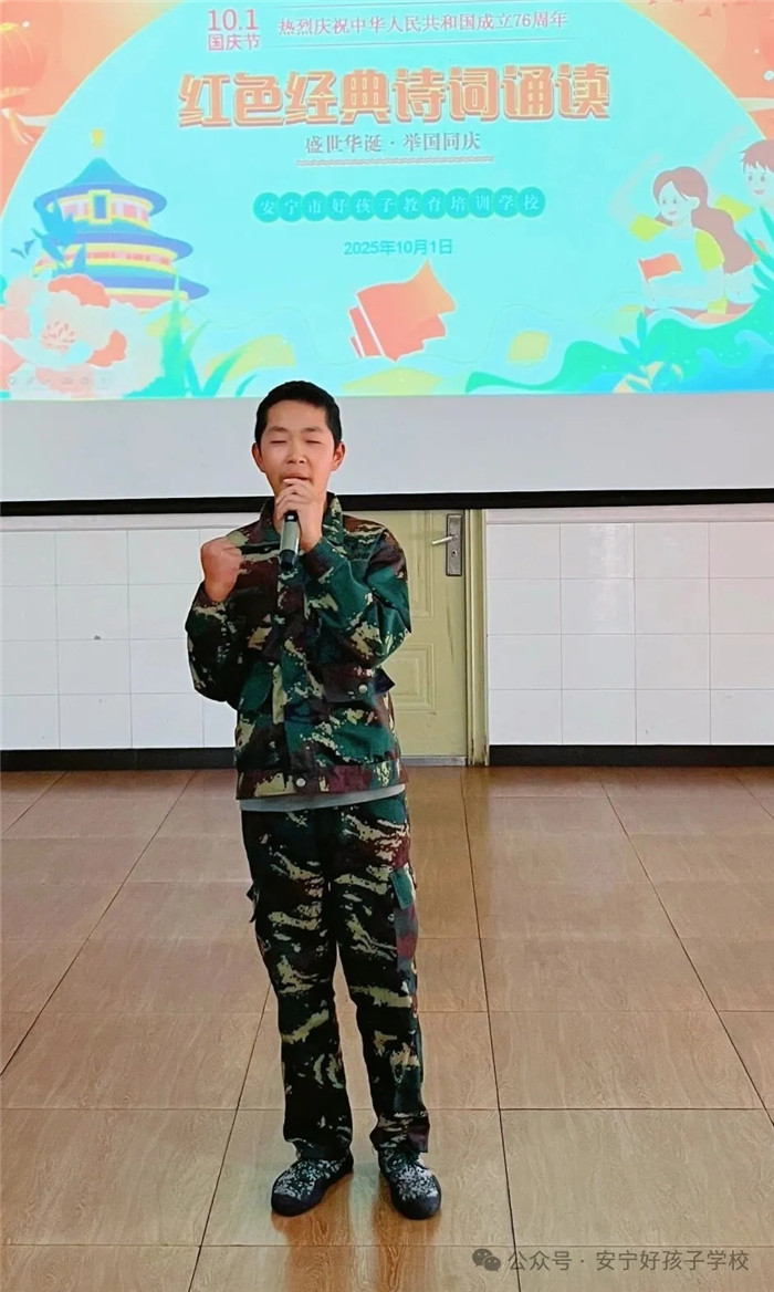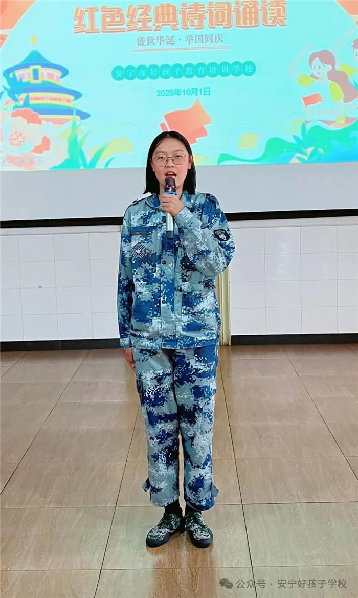 隨后的“紅色經(jīng)典詩詞誦讀”活動同樣精彩紛呈。從《沁園春·雪》的豪邁壯闊,到《七律·長征》的堅韌不屈;從《少年中國說》的朝氣蓬勃,到《我驕傲,我是中國人》的熱血沸騰...... 同學們或獨誦、或合誦,搭配生動的肢體語言與情感飽滿的語調,將詩詞里的紅色故事娓娓道來。臺下師生仿佛穿越時空,在朗朗書聲中重溫革命歲月,讓紅色文化浸潤心靈。